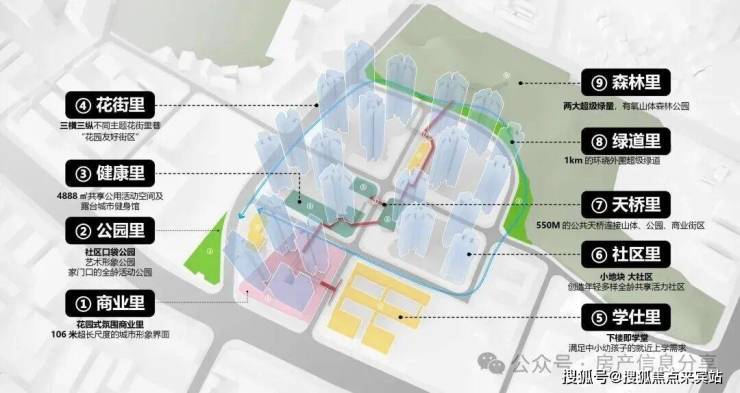 项目规划了约500米的立体城市连廊系统,串联全龄教育、精致商业、品质人居、活力运动、公园休闲等功能板块。