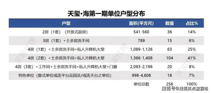 天玺·海第1期共提供256伙住宅单位,户型涵盖两至四房户型,另设有少量特色户,单位的实用面积介乎541至4,608尺,供应以四房户为主,占全盘超过7成,项目最大卖点之一就是景观开扬,有9成单位可以享有维港海景。