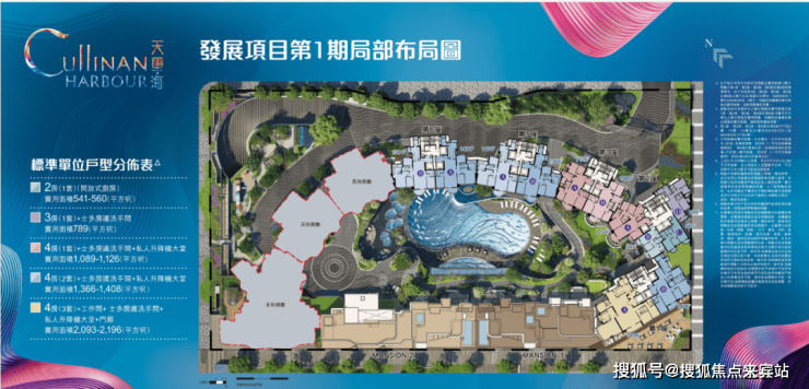 其中,标准分层户占238伙,设2至4房,实用面积541至2,196尺;项目另设有18伙特色单位,户型分别为3至5房,实用面积998至4,608尺,当中6伙更连私人泳池。项目地段优越,前临180度银幕式璀璨维港海景,尽见地王气派。
