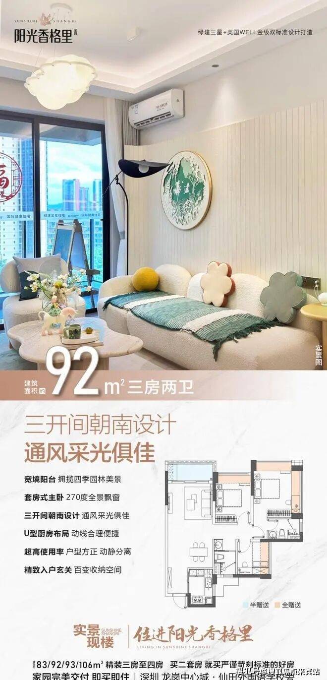 阳光香格里家园基础信息占地面积:16666.34m²,建筑面积:73001.95m²,绿化率:40%容积率:3.27楼层状况:共3栋32层,梯户比:3T6户,总房源:540户,车位比:1:0.9 共459个车位,交房标准:精装修交付,主力户型:68-106m²二至四房,得房率:82%,备案价:3万/m²,学校配套:仙田外国语学校,交通配套:地铁3-21号线新生站900米,