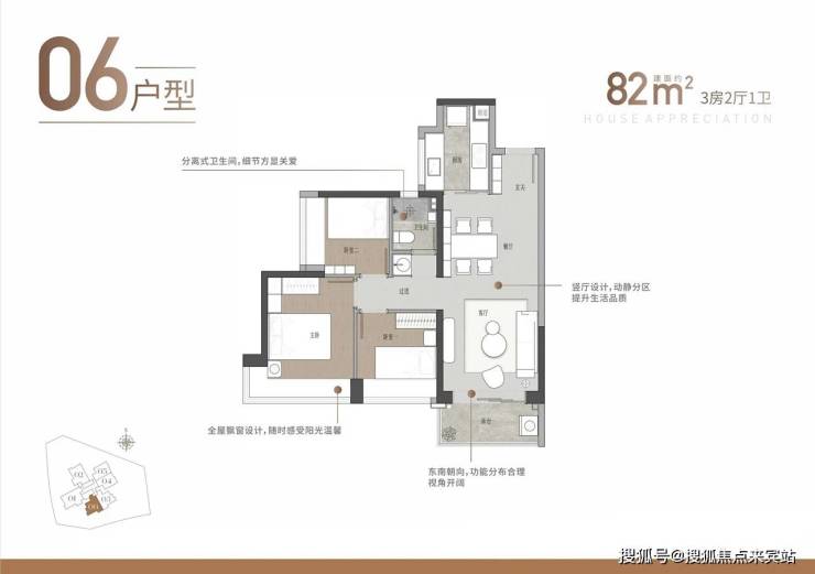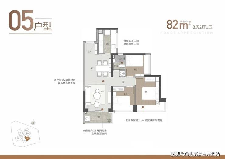 户型面积布局0582平三房两厅一卫设计的是竖厅格局,LDKB一体化设计,三开间朝南,U型厨房,卫生间三段式分离,客厅阳台东南朝向。
