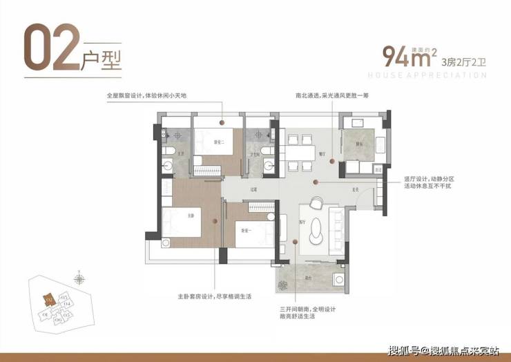 户型面积布局0294平三房两厅两卫设计的是竖厅南北通透格局,进门独立玄关,三开间朝南,U型厨房,客厅阳台西南朝向。