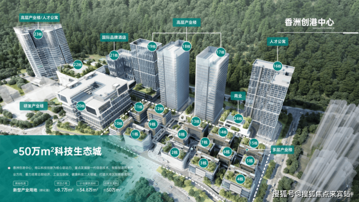 香洲创港中心,位于珠海市香洲区南屏科技生态城,由正方集团开发建设,占地面积约8.7万㎡,容积率约4.0,总建筑面积约50万㎡。