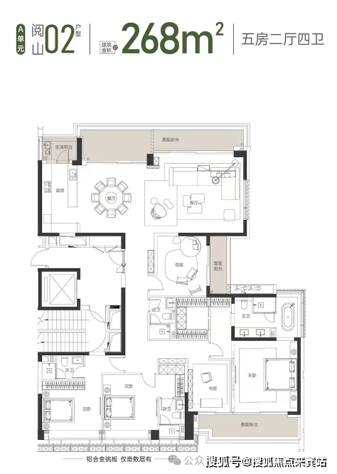 建面约268㎡五房两厅四卫:南北四阳台设计,打造270°全景视野。主卧配置瞰景阳台,三套间设计带来前所未有的舒适度。