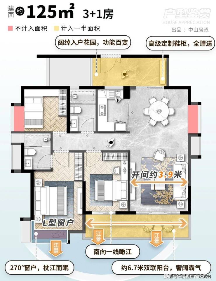 建面约125㎡3+1房,则做到「把江景当成家的一部分」。