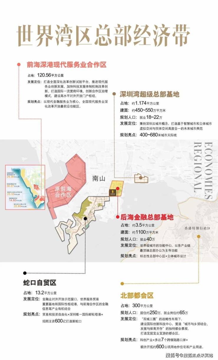 1、区域价值,世界级湾区,后海总部基地,顶级经济聚核:后海金融总部基地与深圳湾超级总部携手,打造以深圳湾为中心,具备全球竞争力的深圳湾超级经济体,其将成为推动深圳超级未来发展的源动力;