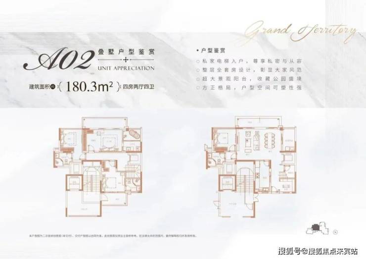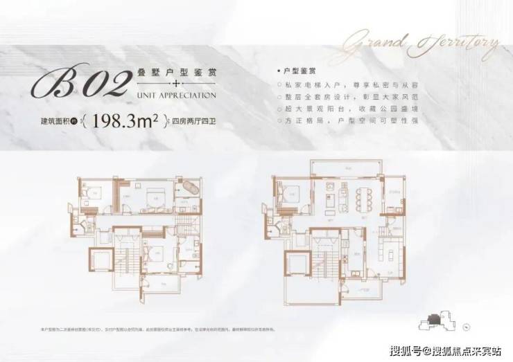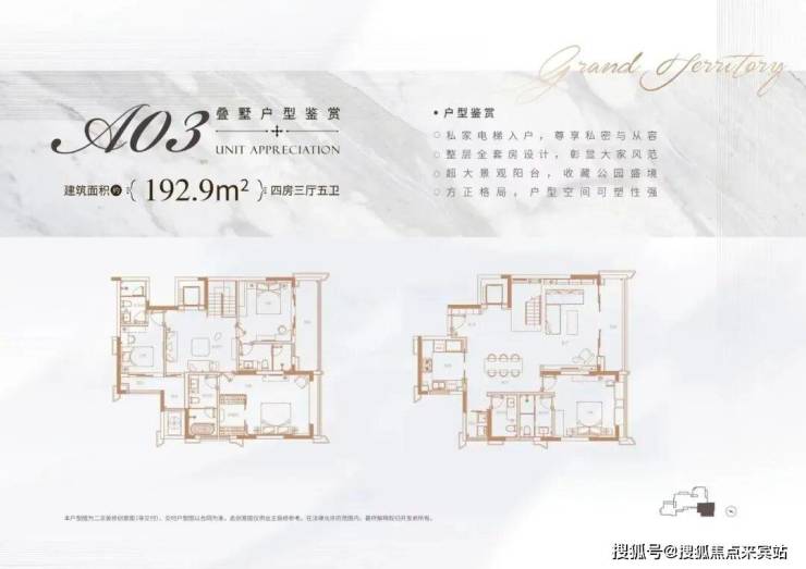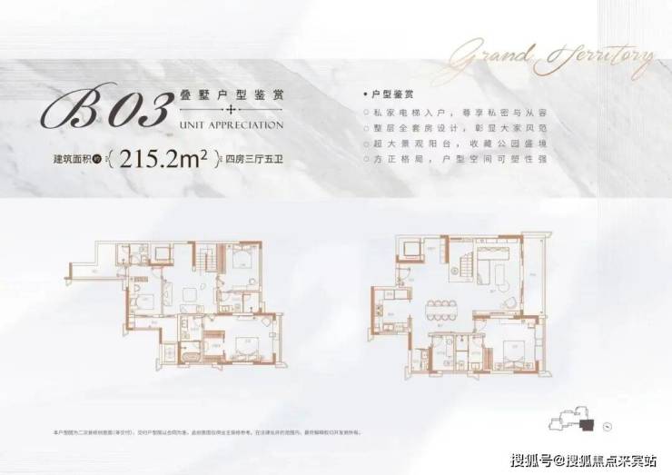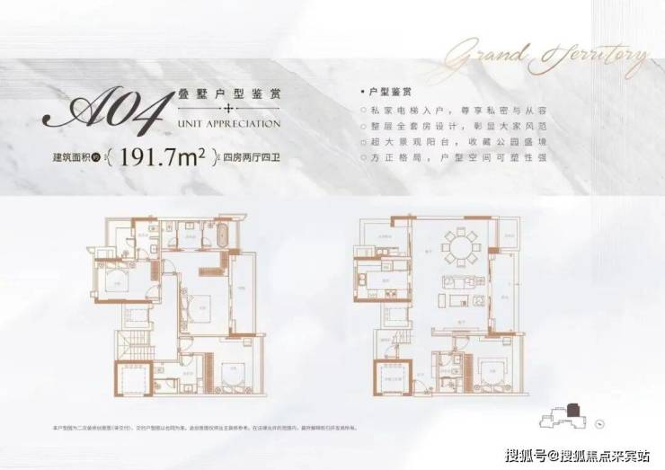 叠墅:总层高6层,面积169-215㎡,分为上、中、下叠三户。上叠约168-206㎡,为5-6层,赠送天台花园;中叠约198-215㎡,为3-4层;下叠约172-192㎡,为1-2层,赠送一楼花园和地下室。户型均为四房两厅或三厅五卫,私家电梯入户,全屋套房设计,配备超大景观阳台。
