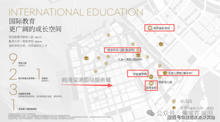 学校:项目楼下配备18班幼儿园和9年制学校,距离800米有公立前海创新集团妈湾学校(预计今年9月开学),国际学校:哈啰公学和妈湾荟同学校,以及片区还带有亚洲顶级成人工商学院“中欧商学院”,满足全年龄段教育;