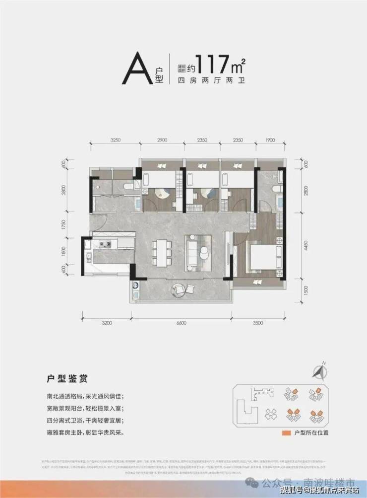 117㎡ 4房2厅2卫:稀缺南北通透、大横厅阔绰4房,约6.6米阔景阳台 ,四分离卫生间