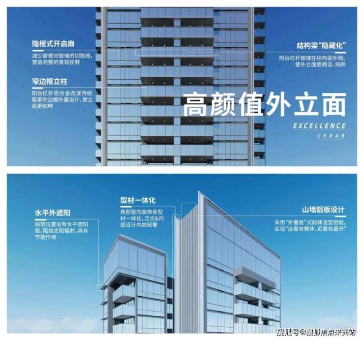以写字楼和高级住宅美学工艺,锻造铝板幕墙+LOW-E玻璃外立面,超纤细边框设计,展现极简前沿风格。