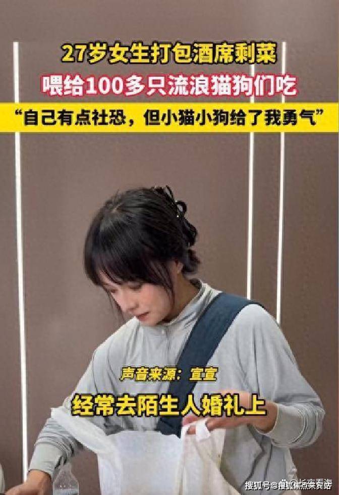 想到这个办法后,她就开始去婚宴打包剩菜了。宣宣本来有点害羞,但是为了猫咪们能吃饱,她就主动走到那些不认识的新人面前,然后说出自己的想法。通常呢,新人们都能理解她,也支持她。有的人甚至会很热情地请她坐下来一起吃。不过她都会很有礼貌地拒绝,但是她会在礼金簿上放个100块钱左右。她笑着说,这是“小猫小狗交的饭钱”。我觉得这个细节特别暖心,也体现了她对新人的尊重。