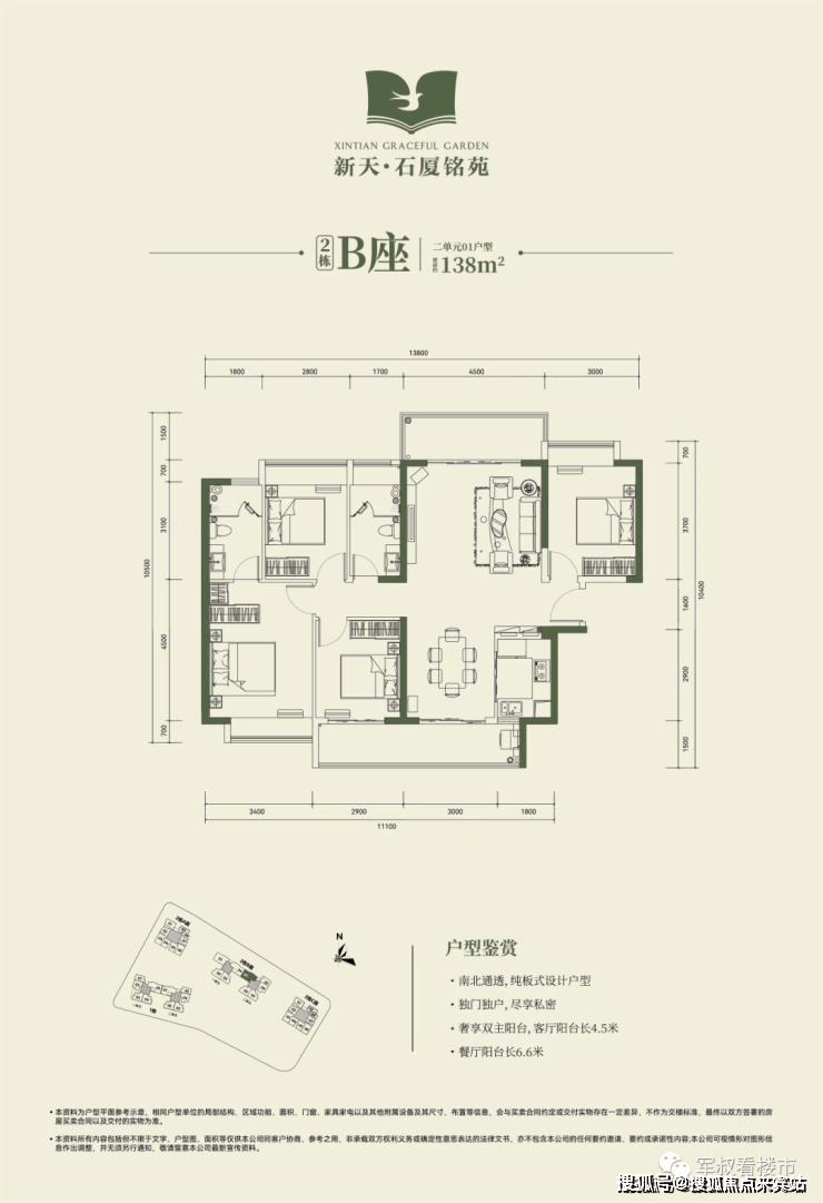 🔹2栋B座一单元01、04户型、2栋B座二单元01户型:面积约为137-138㎡的4房2厅2卫;