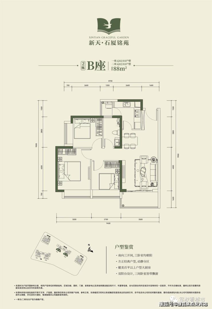 🔸2栋B座一单元02、03户型、2栋B座二单元02、03户型:面积约为88㎡的3房2厅1卫;
