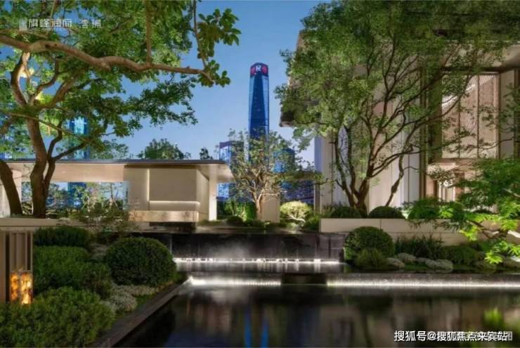 「一轴一核三环·六大溪谷雅境」:约400m²中央水院,五层叠瀑呈现立体流动水景