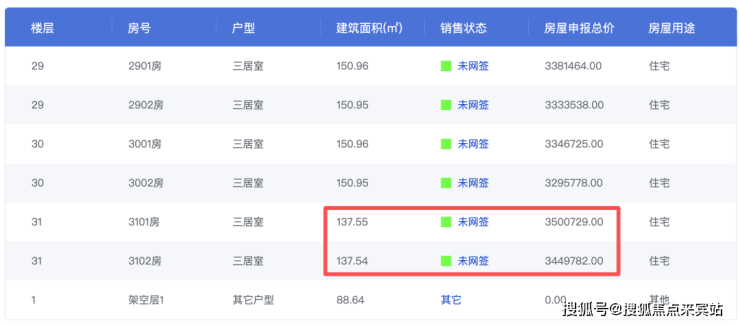 据备案价显示,3栋共有约150平和约137平两种户型,其中1-30层均为约150平户型,顶楼31层为两套约137平。