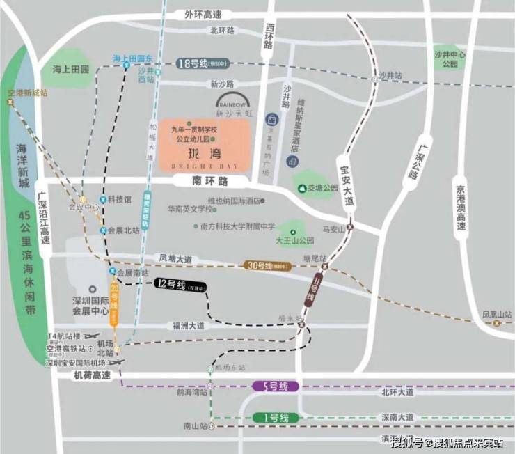 目前项目周边有11号线和在建的地铁12号线、20号线和穗莞深城轨,但项目刚好处在几个站点的几何中心,距离大致在1.7-2公里,步行距离稍远临近宝安大道、107国道、东部沿海高速、沙井路、南环路等多条主干道。
