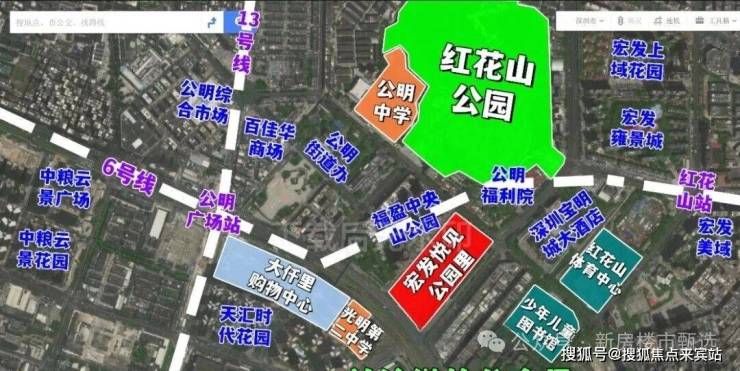 宏发悦见公园里,位于光明区公明街道松白路与红花中路交汇处,该片区属于公明最核心的区域,背靠红花山公园,一路之隔对面是大仟里购物中心,西侧是红花山体育中心,光明区图书馆(红花山分馆),6/13号地铁线双地铁口物业,分别是”红花山站","公明广场站"。