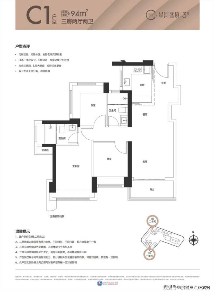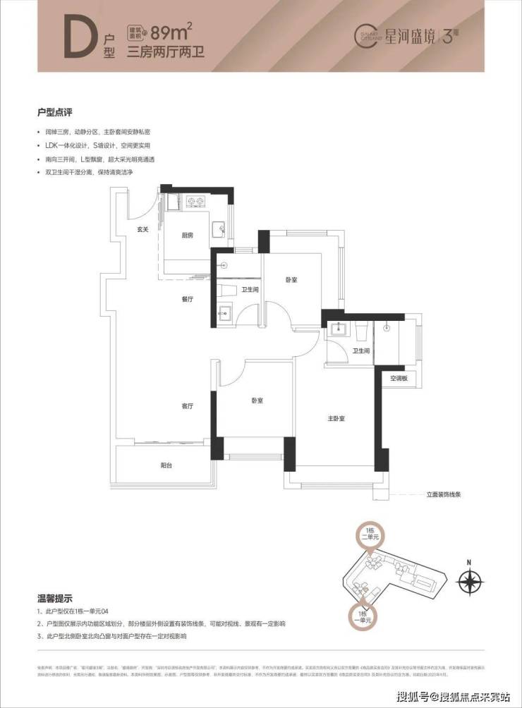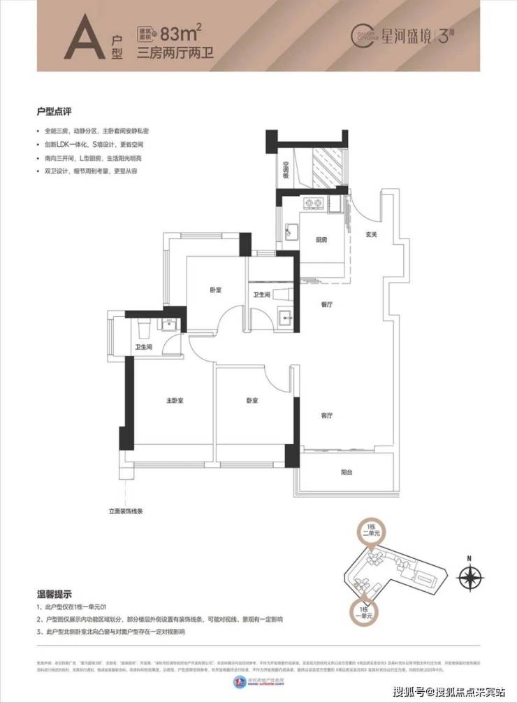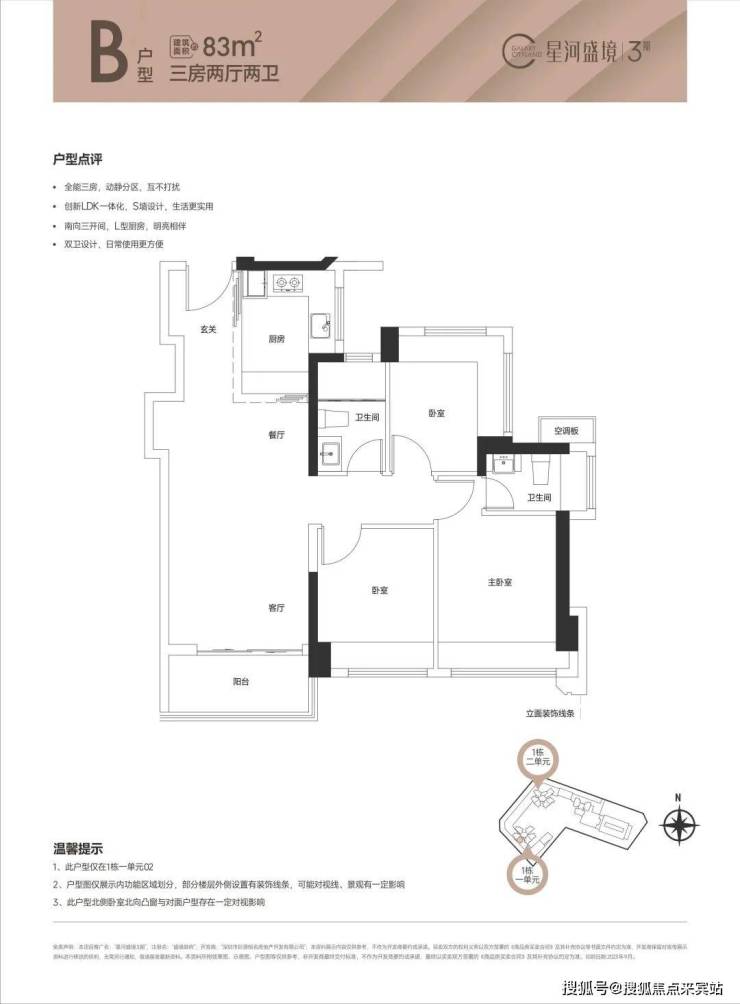 户型设计精致合理,空间利用率高,如83-87㎡的3房2厅2卫,设计为经典竖厅格局,客厅实测3.14米开间,LDKB一体化,S墙设计预留冰箱卡槽位,三开间朝南,3个卧室分别做到了主卧10.8㎡/次卧8.65㎡/次卧6.28㎡(实测面积,不含墙体),U型灵动式厨房,卫生间干湿分离,得房率约76-81%(不含赠送),西南朝向。