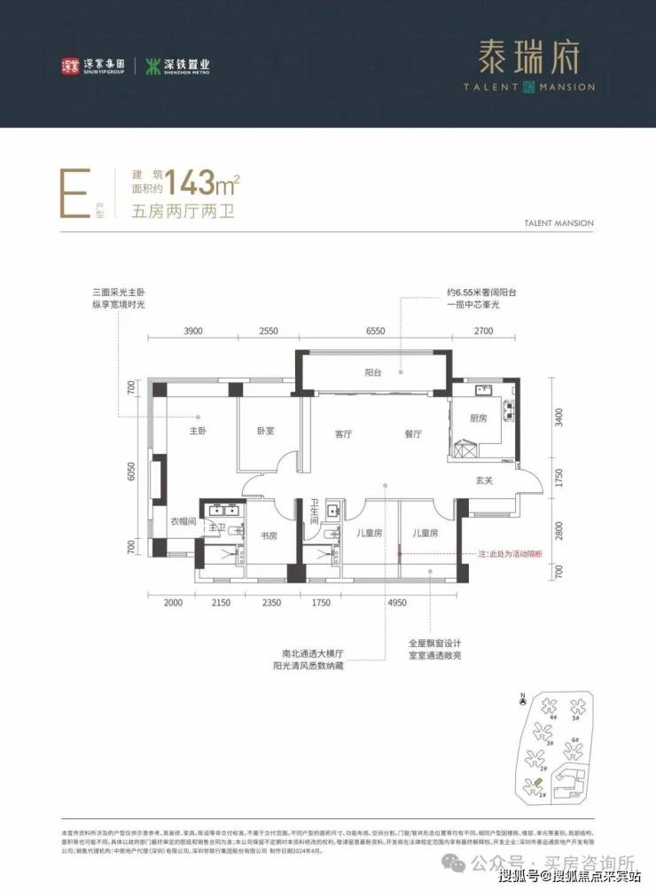 115-143㎡的4房2厅2卫,设计的横厅南北通透格局,半开放式厨房,其中143㎡主卧有独立衣帽空间。