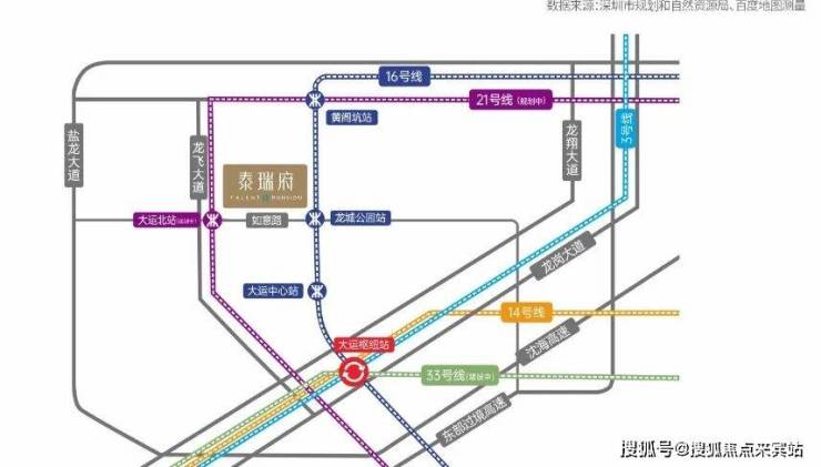 深业泰瑞府位于龙飞大道与如意路交界处,项目距离16号地铁线龙城公园站也只有700米,距离在建深惠城际大运北站约100米,预计2026年底开通。