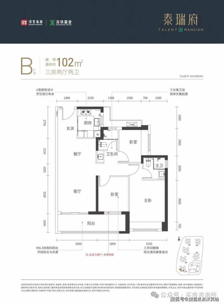 102㎡的3房2厅2卫,设计的竖厅格局,客厅连着卧室出大阳台,U型厨房,有东南朝向及西南朝向。