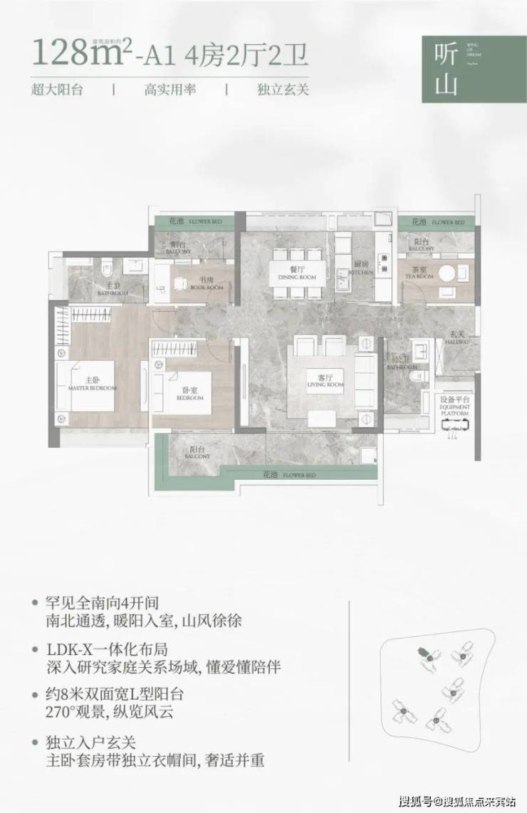128㎡的四房户型,设置了阳光玄关,约 8.1 米的 L 型阳台,采光和视野都很不错;