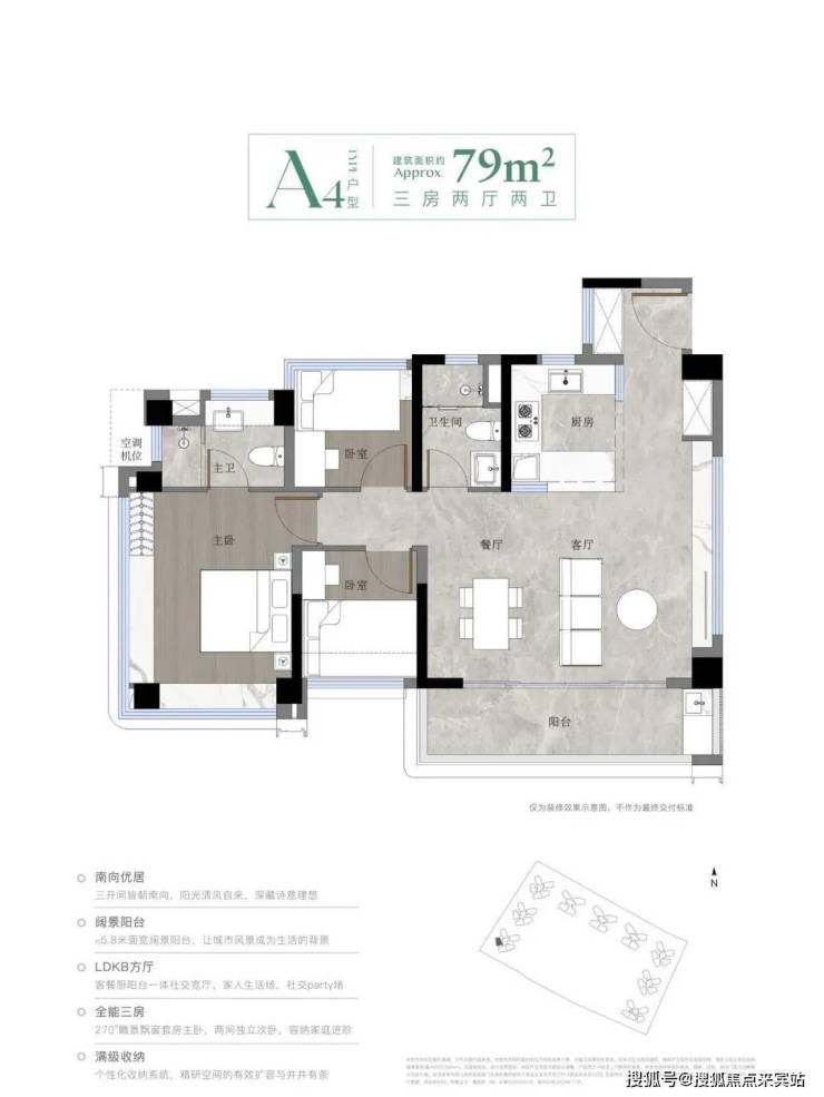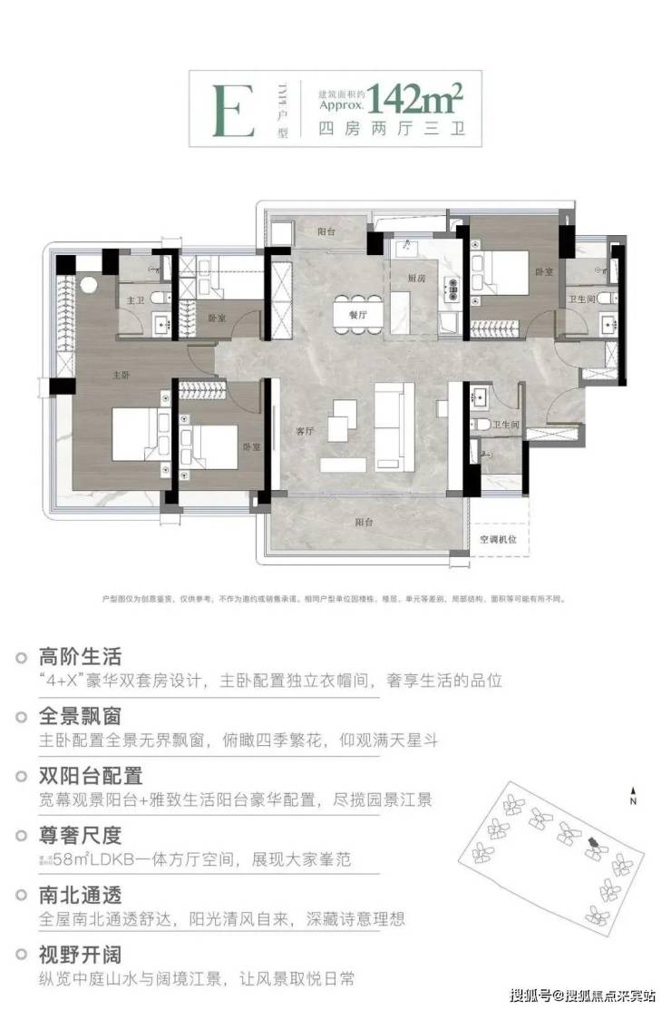79平也是南向,其中改善108-128-142都是三梯四户的超高层楼栋,新规户型使用率超100%,全南向优景,户户都有大阳台,而且每一户的主卧室都是240度的窗景,这一点,确实蛮牛的。