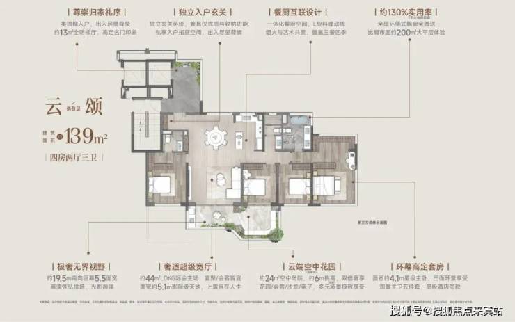 约139㎡户型,是约117㎡户型的再升级,阳台、露台、飘窗,加上约13平全明电梯前室公共空间,超高实用率约140%。