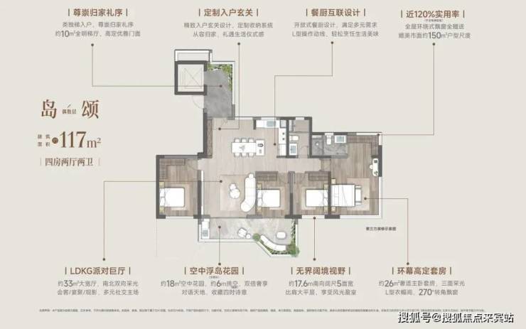 约117㎡户型,被飘窗、阳台、露台等赠送空间紧紧包围着,实用率达到119%,若是把专属电梯入户空间也算上,实用率直逼129%。