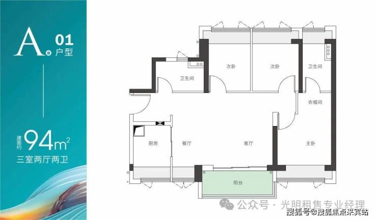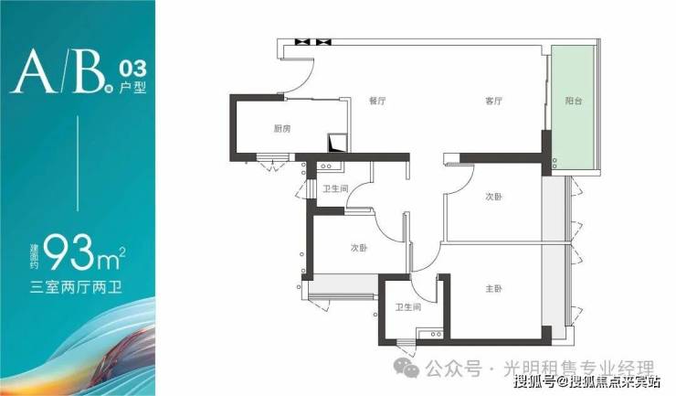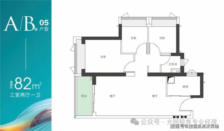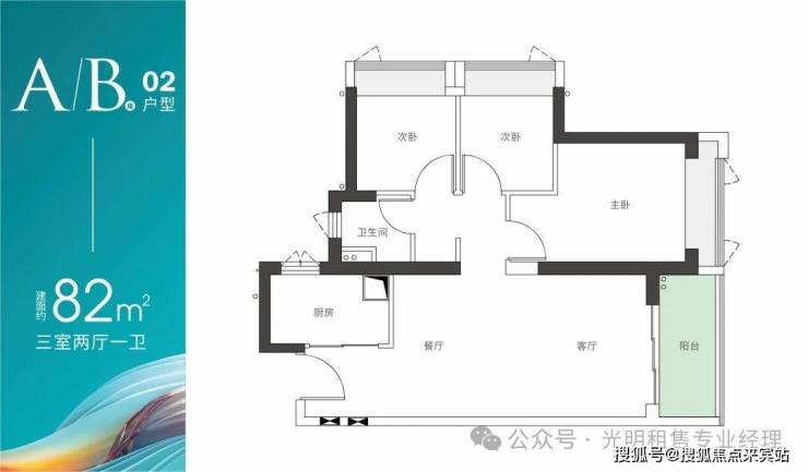 户型鉴赏【82-115m²】A/B座02户型-建面约82m² 三房两厅一卫