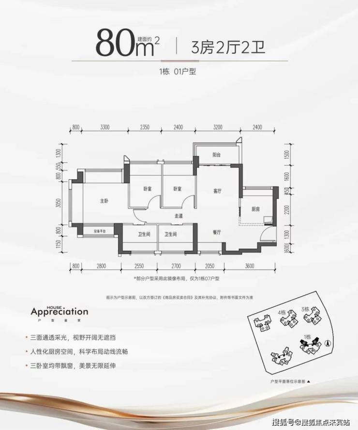 80㎡是本批次产品中唯一设计为南北对流格局,而且是整体横向采光,位于1栋,仅有2条腿,朝向社区内部园林相对静谧。