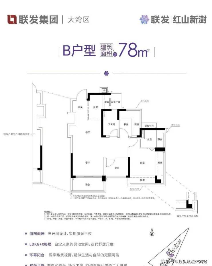 约78㎡的2+1房2厅2卫,设计的是竖厅LDKG+X格局,S墙设计预留冰箱卡槽位,做到了主卧双飘窗,三开间朝南,动静分区,U型大厨房,厨房烟道还做了外置空间,可以更好的利用厨房空间,卫生间三段式干湿分离。赠送了双阳台一半面积+6面飘窗+双设备平台,超100%得房率,东南或西南朝向。这是整个红山板块唯一一个80平以下做到了3房2卫的户型。