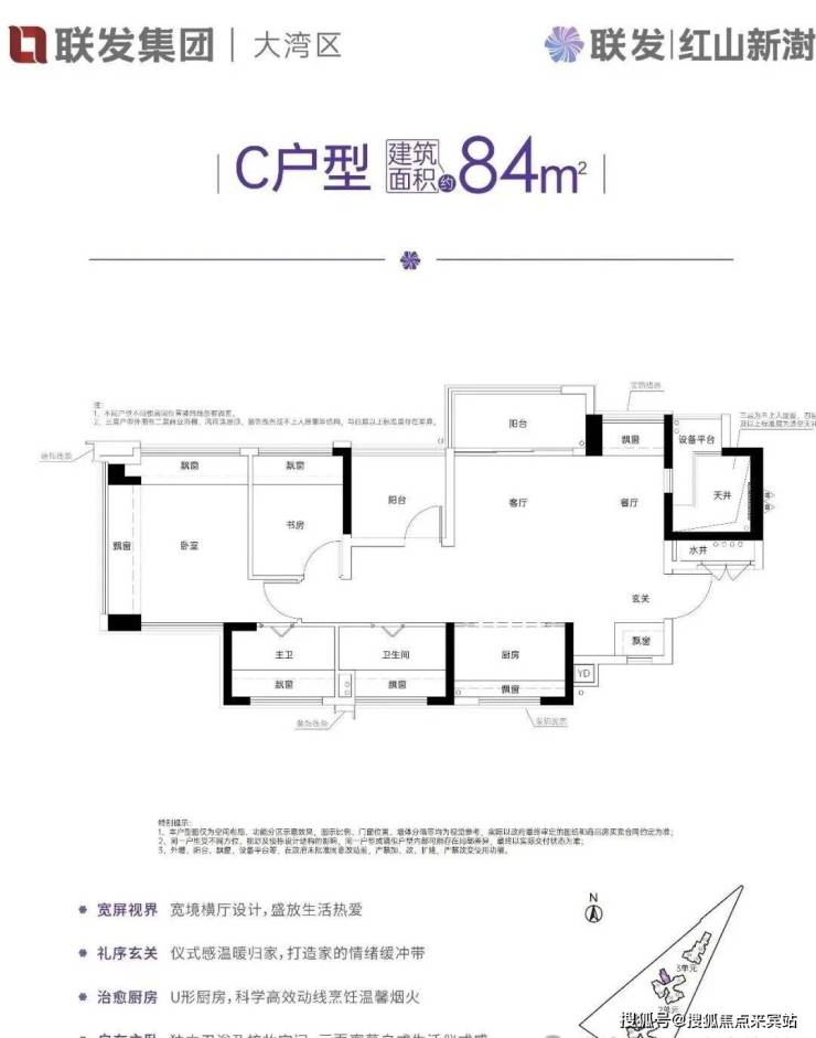 约84㎡的2+1房2厅2卫,设计的是横厅南北通透格局,独门独户还有私用公区,客餐厅一体化设计,做到了主卧双飘窗,动静分区,U型大厨房,厨房烟道还做了外置空间,可以更好的利用厨房空间,卫生间干湿分离。赠送了双阳台一半面积+8面飘窗+1个设备平台,超100%得房率,阳台主朝东北向。