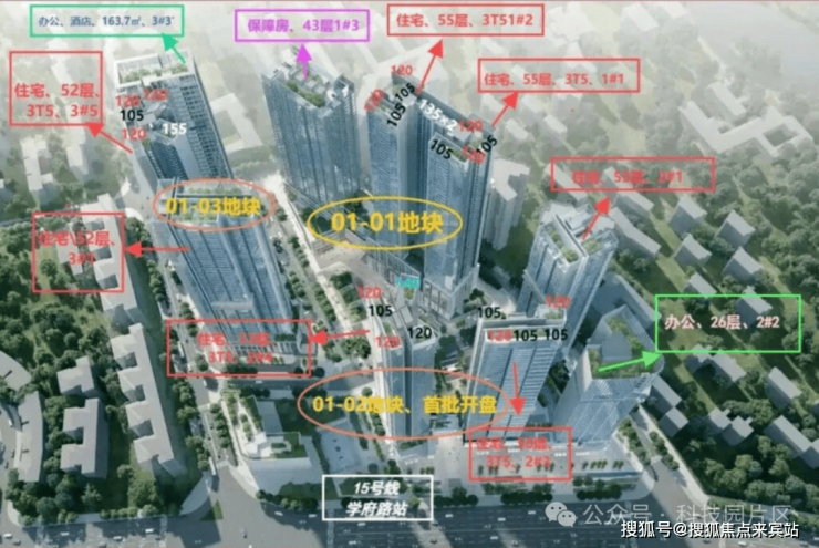 01地块占地约1.5万㎡,建面约17.3万㎡,规划3栋住宅(44-55层)+1所幼儿园。住宅8.9万㎡(1038户),商业3.2万㎡,车位834个。