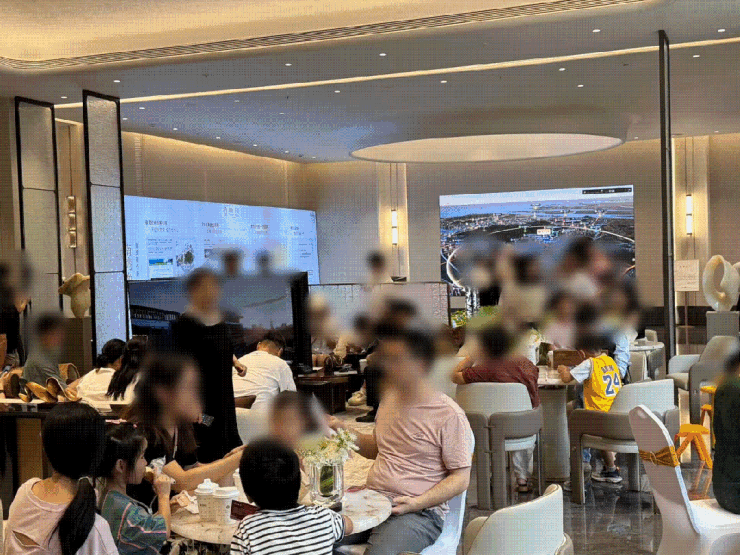人从众,沙盘、洽谈区挤满了前来看房的买家,销售中心宛如景点般热闹,用座无虚席来形容,也丝毫不为过。