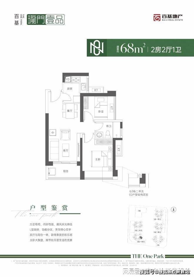 68㎡的2房2厅1卫,仅3栋1单元02户型,设计的是竖厅格局,客厅3.2米开间,LDKB一体化设计,L型厨房,卫生间干湿分离,得房率:71.3%(不含赠送),东南朝向。