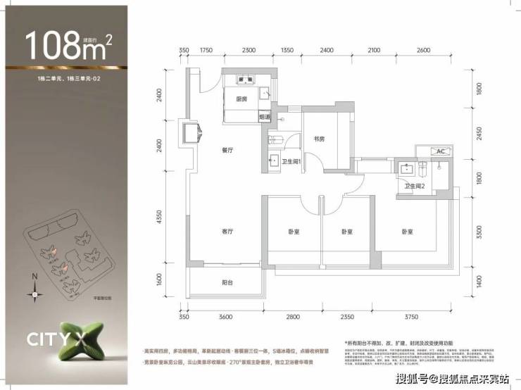 108平的户型拥有约3.6米开间,全南向客厅和卧室。