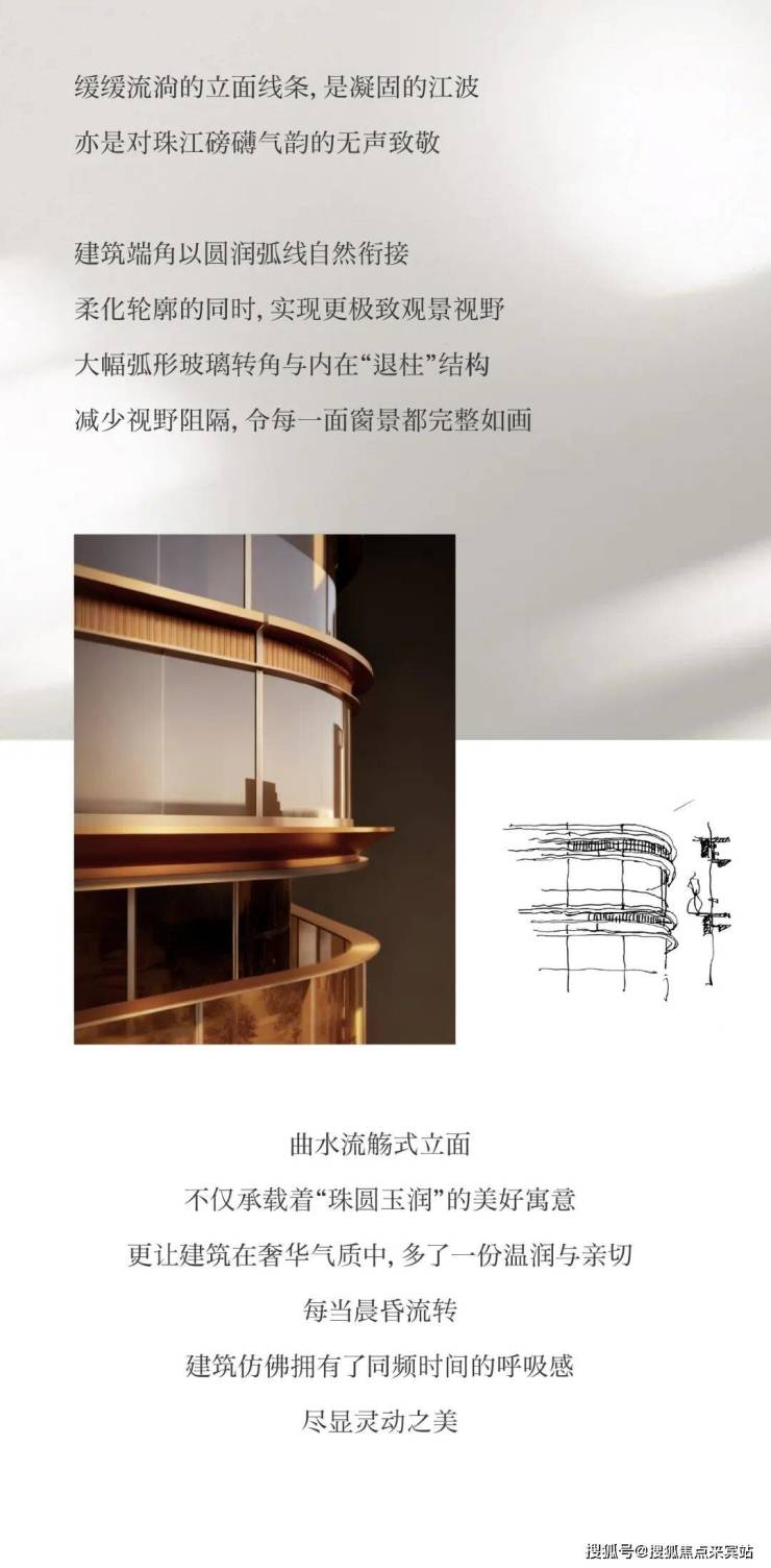 外立面采用木色陶板与全景玻璃幕墙,以“曲水流觞”的涟漪造型呼应珠江文脉,同时融入垂直生态理念,打造空中绿岛与可呼吸的建筑肌理。