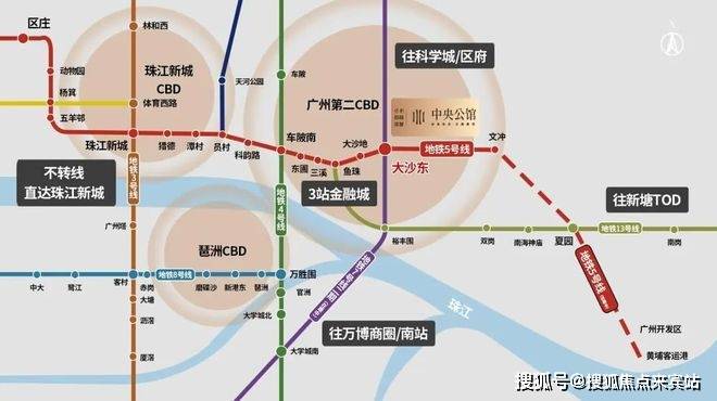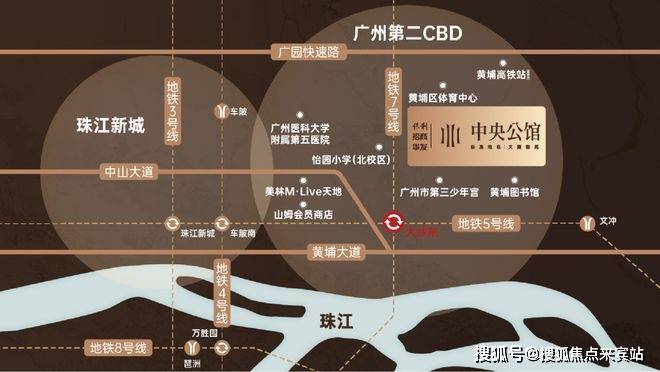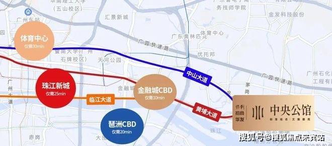 保利招商华发中央公馆地处广州东进桥头堡,属于广州第二 CBD 范畴,虽非传统中轴核心,但凭借优越的交通条件可超链万亿商圈。项目拥有约 550 米内双地铁优势,家门口就是 5/7 号线双地铁大沙东站,5 号线 3 站可达天河金融城,约 26 分钟直达珠江新城不换乘;7 号线 3 站到黄埔科学城,7 站到番禺万博。自驾方面,依托黄埔大道、中山大道等城市主干道,约 15 分钟通达金融城核心,约 30 分钟畅达琶洲 CBD 和珠江新城 CBD。借助这些交通,业主能快速融入广州的万亿商业圈,享受丰富商业资源。