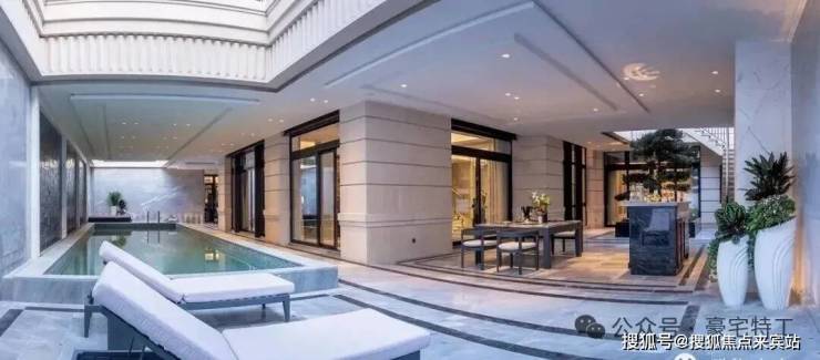 全屋葡萄牙米黄石铺盖,大师原石雕刻;会客厅7.2m挑高,三面落地玻璃窗高采光,通透阳光负一层