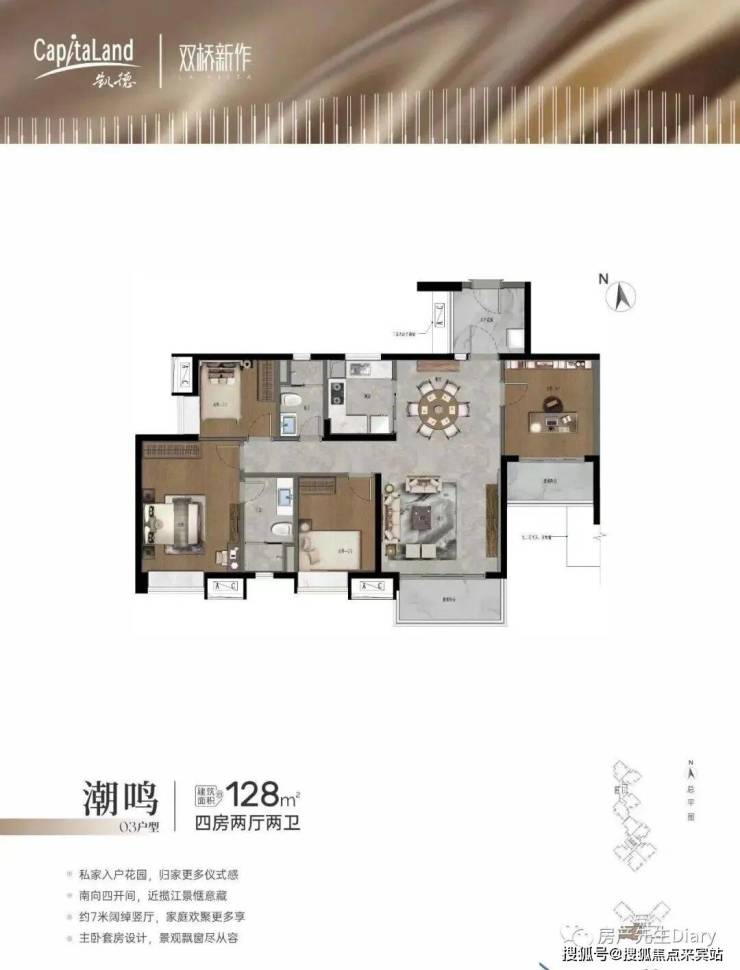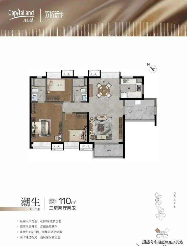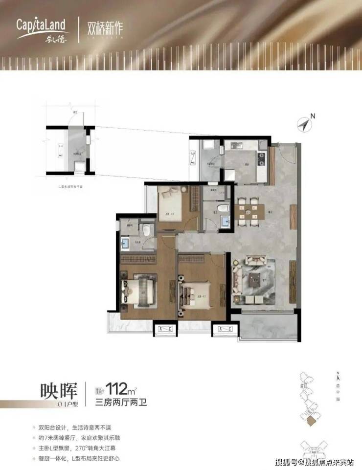 凯德双桥新作项目占地面积不大,仅有3栋33层高层住宅,总户数411户,分别是两梯四户的北塔、南塔以及两梯五户的中塔。