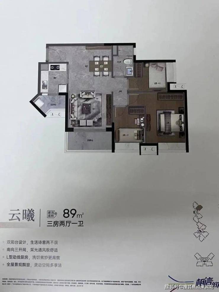 89㎡三房,三开间朝南,客厅宽敞双阳台设计,这个户型是整个项目中比较好的,预计会比较抢手。