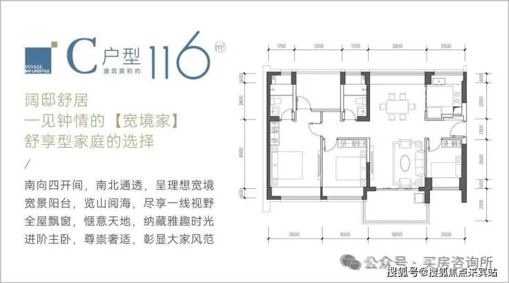 116㎡4房2卫:南北通格局,客厅开间3.8米主卧3.5米,有一个阳台改卧室;