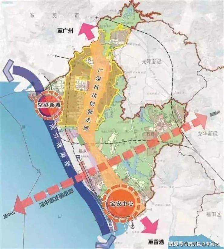 粤港澳湾区核心枢纽+大空港一级辐射区+◆光明科学城一级辐射区◆粵港澳湾区核心枢纽:位处粤港澳城市群中心,广深港科技创新走廊中轴,占位粤港澳湾区核心枢纽;