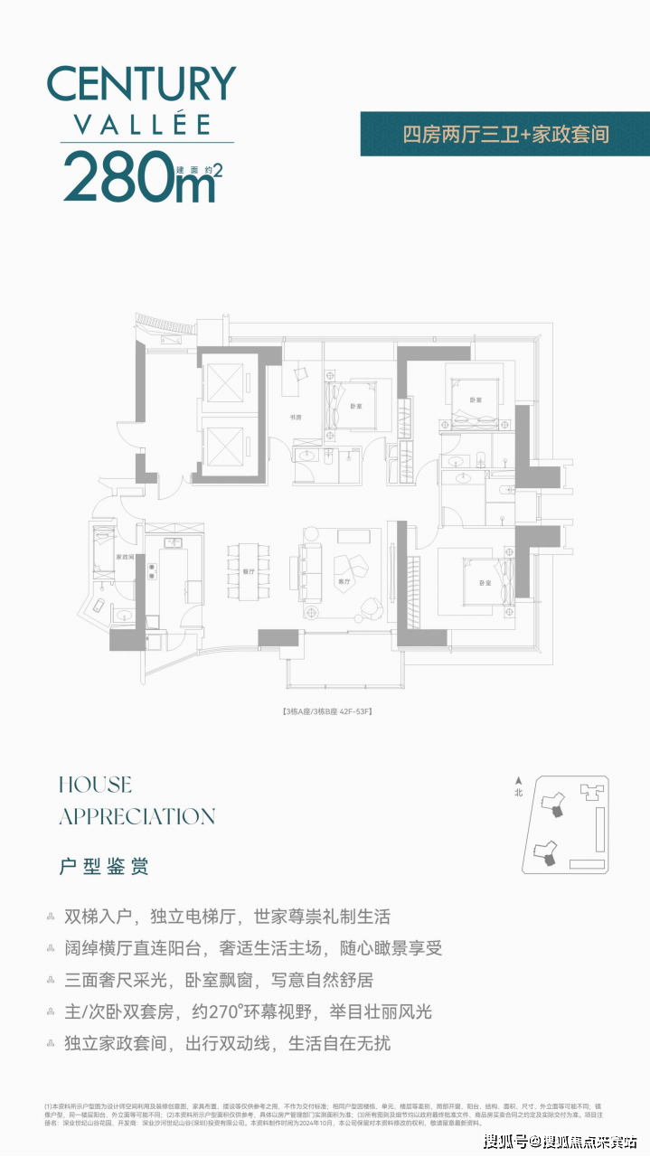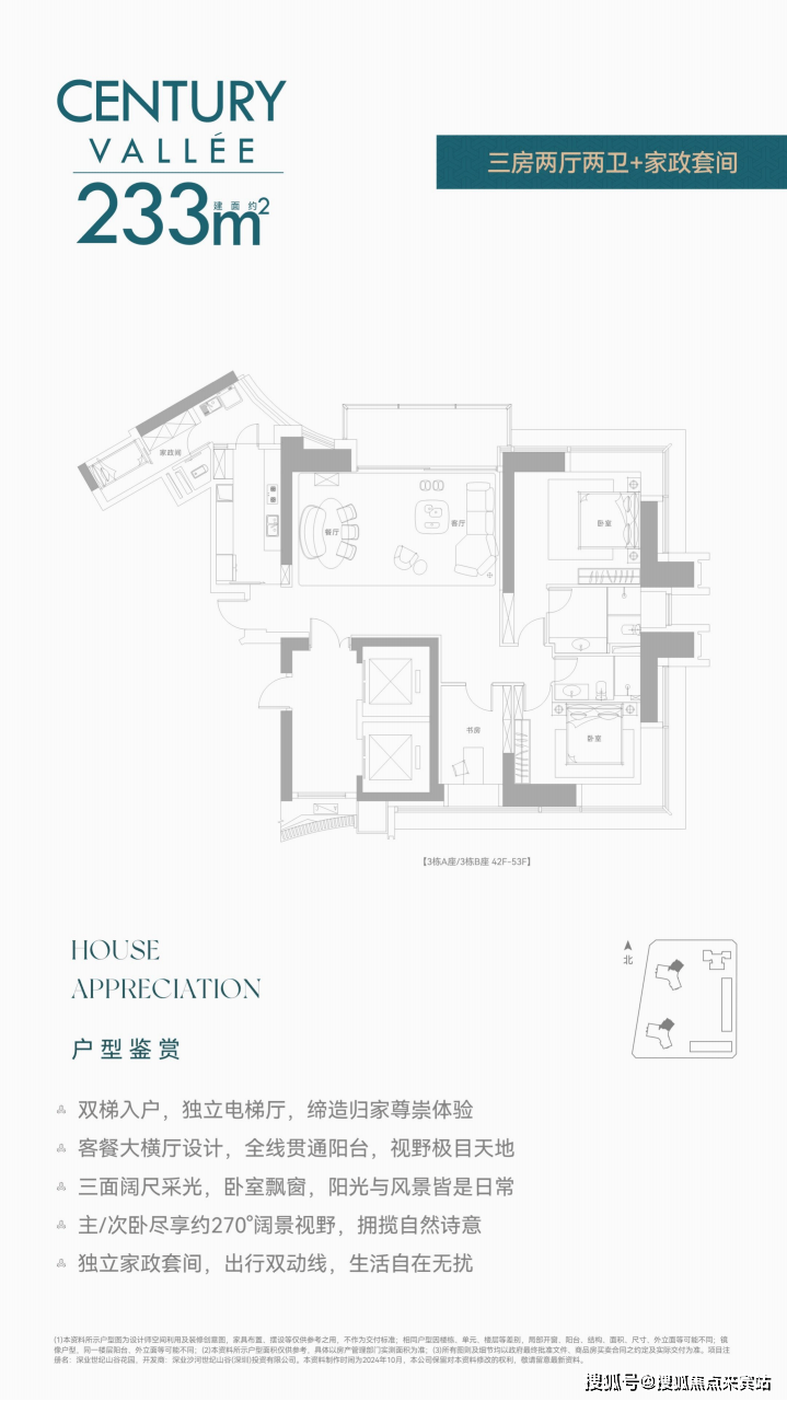 约233㎡3+1房3卫 A户型,西北朝向看名商和沙河高尔夫;