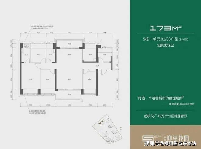 【五栋一单元-平面图】3梯3户,3条腿,分别是01、03号房户型约173㎡的5房2厅2卫、02号房户型约149㎡的5房2厅2卫