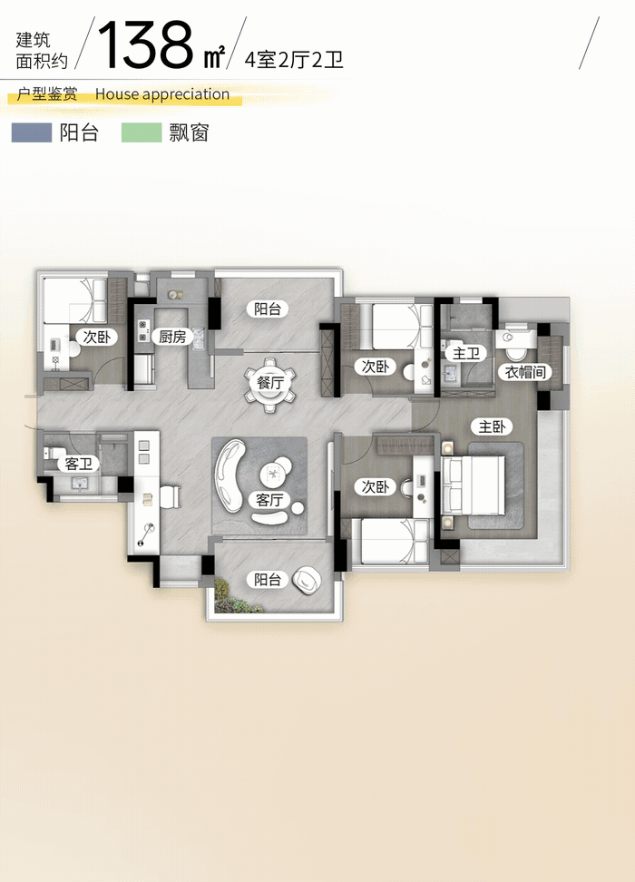 建面约138㎡四房,三代同堂、二孩家庭的终极改善选择。