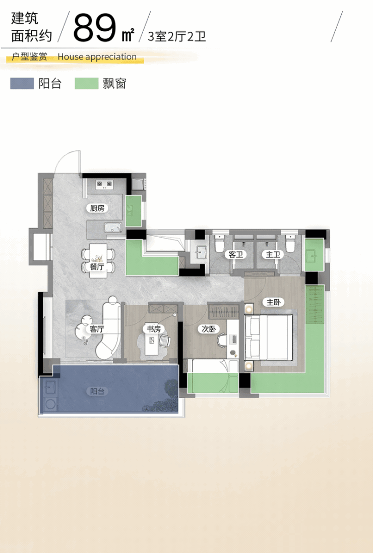 南向采光超16米,南北对流,全屋有11个飘窗,既增加采光面,又提高空间使用率。客厅双面采光,与次卧共享长约6.45米的阔景阳台。