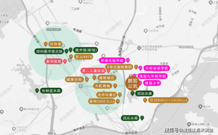 商业:自带3500㎡商业,底商不够丰富,周边1公里内有8号仓奥特莱斯购物中心,1.5公里范围分布有民治天虹购物中心、星河COCO PARK、星河COCO CITY等多个购物商场。