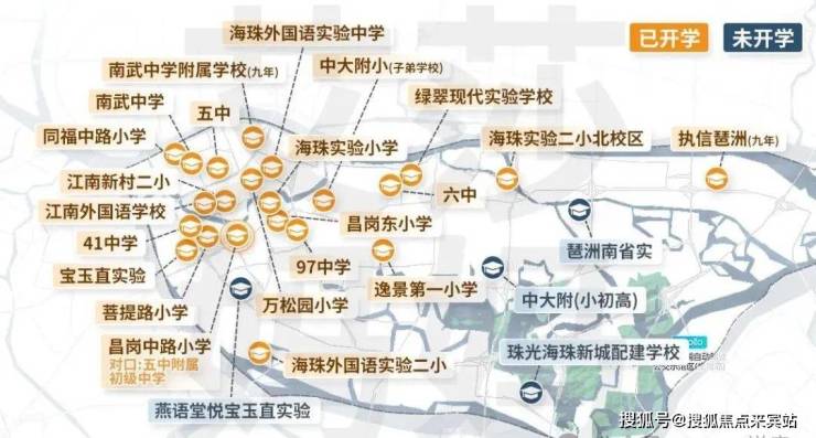 项目自带学校:小区自身配套一所 12 班的幼儿园和一所 36 班的九年一贯制学校,且已与广东实验中学、海珠区教育局正式签订合作办学意向。